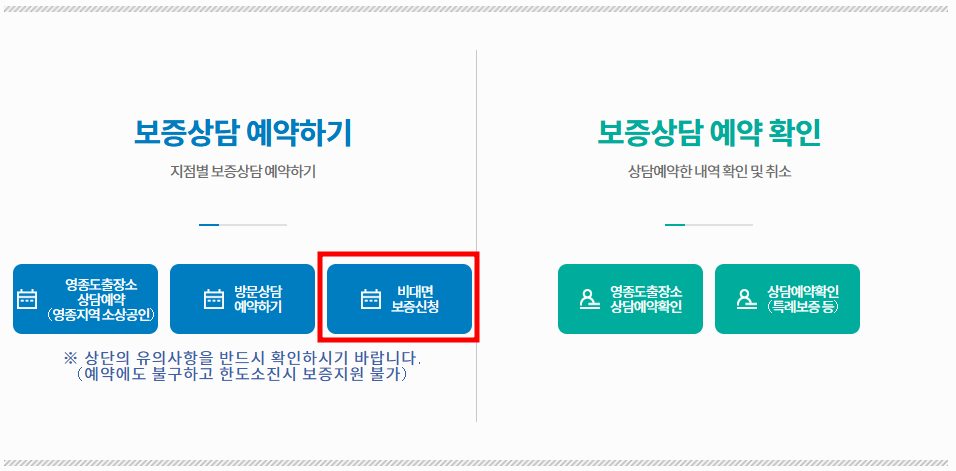 1) 인천신용보증재단 홈페이지 내, [보증상담예약 - 비대면보증신청] 하시면 됩니다.