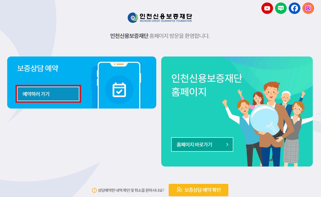 1) 인천신용보증재단 홈페이지 내, [보증상담예약 - 비대면보증신청] 하시면 됩니다.