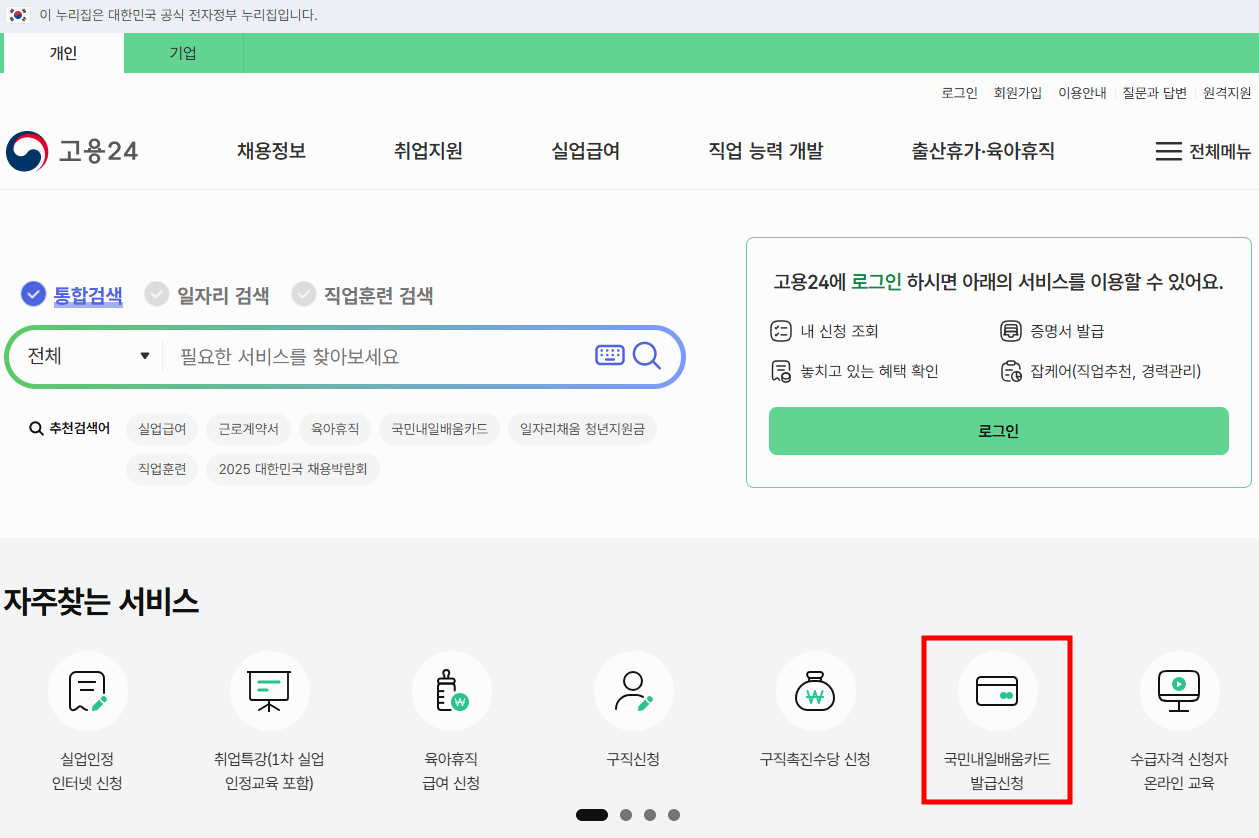 ②-1 아래 자주찾는 서비스에서 '국민내일배움카드 발급신청' 선택