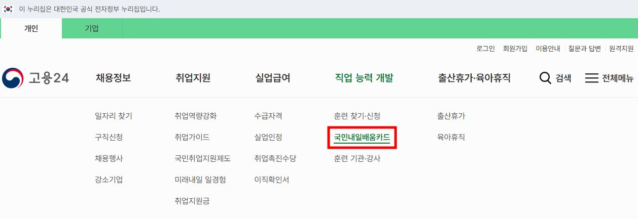 ② -2 메인 메뉴중 '직업 능력 개발' 하단 메뉴 중 '국민내일배움카드' 선택