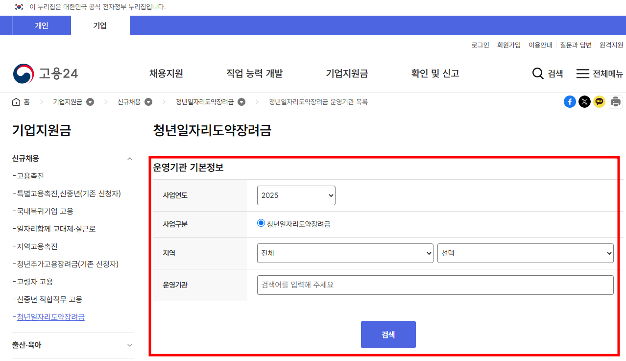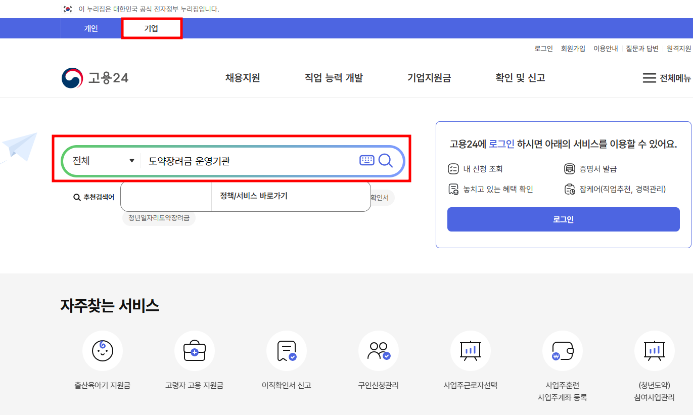 ② "고용24" 상단의 "기업 탭"에서 "도약장려금 운영기관" 검색하기