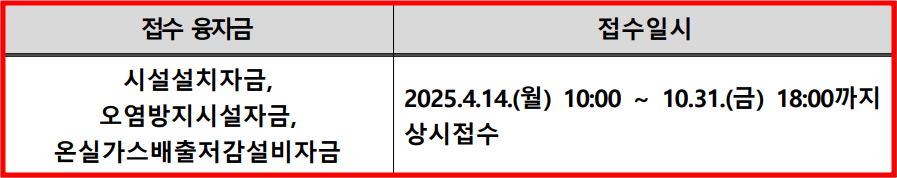 · ( 융자접수 ) - 2025년 4월 14일(월) 10:00 ~ 2025년 10월 31일(금) 18:00까지 상시접수