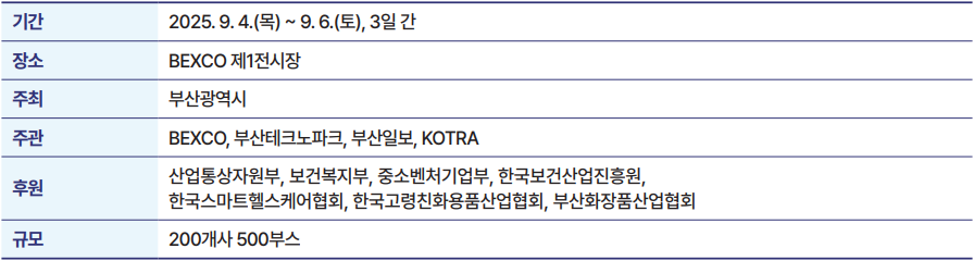 이 행사는 복지, 재활, 항노화, 스마트헬스, 화장품·뷰티 등 다양한 헬스케어 산업 분야의 기업들이 국내외 바이어를 만날 수 있는 실질적인 비즈니스 장입니다