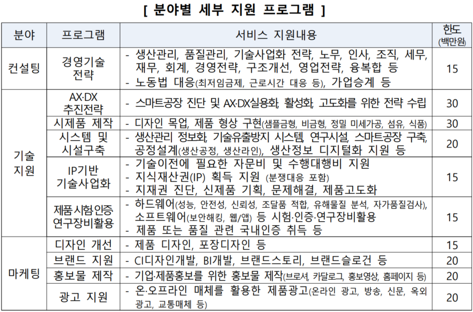 · 지원내용컨설팅, 기술지원, 마케팅 3가지 분야, 10개 프로그램을 이용할 수 있도록 바우처 형태로 제공