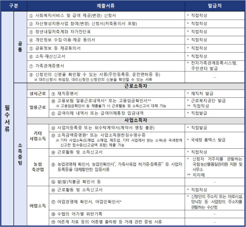 ※ 직접 작성하는 양식(① ② ③ ④ ⑤ ⑥ ⑩ ⑭)은 읍면동 주민센터 또는 자산형성포털에서 제공