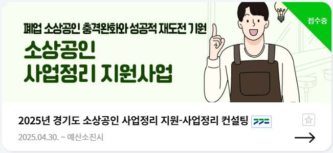 경기도 소상공인 사업정리 지원사업은 사업을 중단하거나 폐업을 준비 중인 소상공인에게 컨설팅, 정리비요으 행정 절차 등을 종합적으로 지원하는 맞춤형 지원사업입니다.